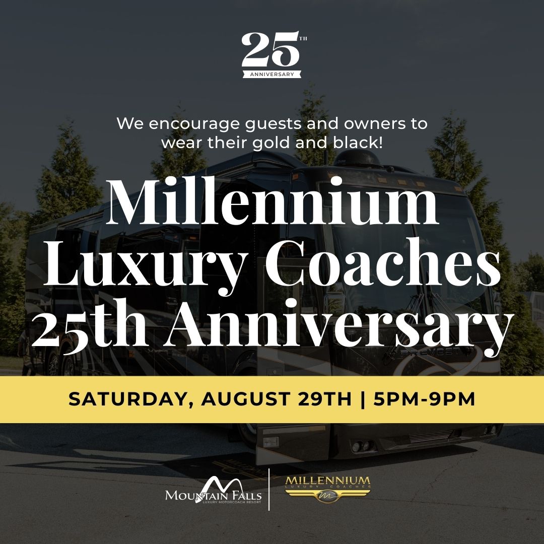 Join us at the clubhouse to celebrate 25 Years of Excellence with Millennium Luxury Coaches. Start the evening with coach tours and a cocktail reception by the coaches. Later move into the clubhouse for dinner, dancing under the covered terrace, cake cutting and champagne toast. Come dressed in your finest black and gold!