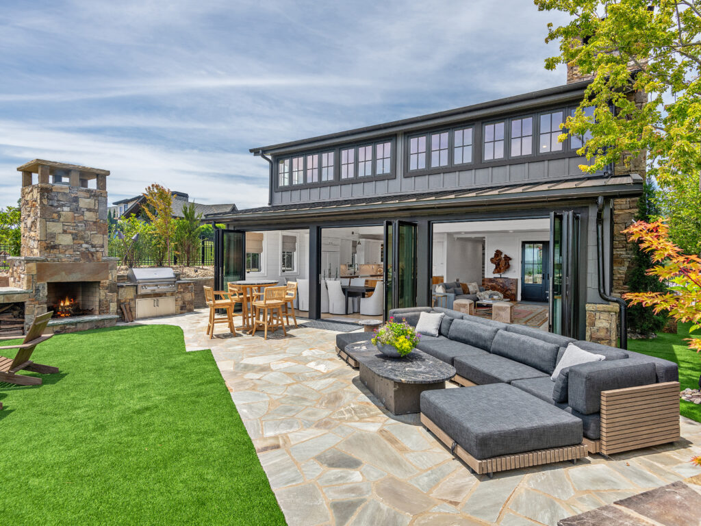 Thoughtfully designed workspaces and seating nooks are bathed in natural light, while expansive folding glass doors open to an inviting outdoor living area complete with stone fireplace, built-in grill, dining terrace, and lush green lawn—perfect for entertaining or relaxing year-round.