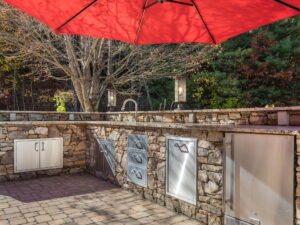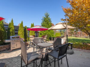 Thoughtfully arranged with multiple seating and dining areas beneath vibrant umbrellas, the expansive paver patio provides plenty of room for hosting friends or simply unwinding fireside. The custom stone outdoor kitchen with built-in grill makes cooking outdoors a breeze, while the surrounding mature landscaping creates natural privacy and a peaceful atmosphere.