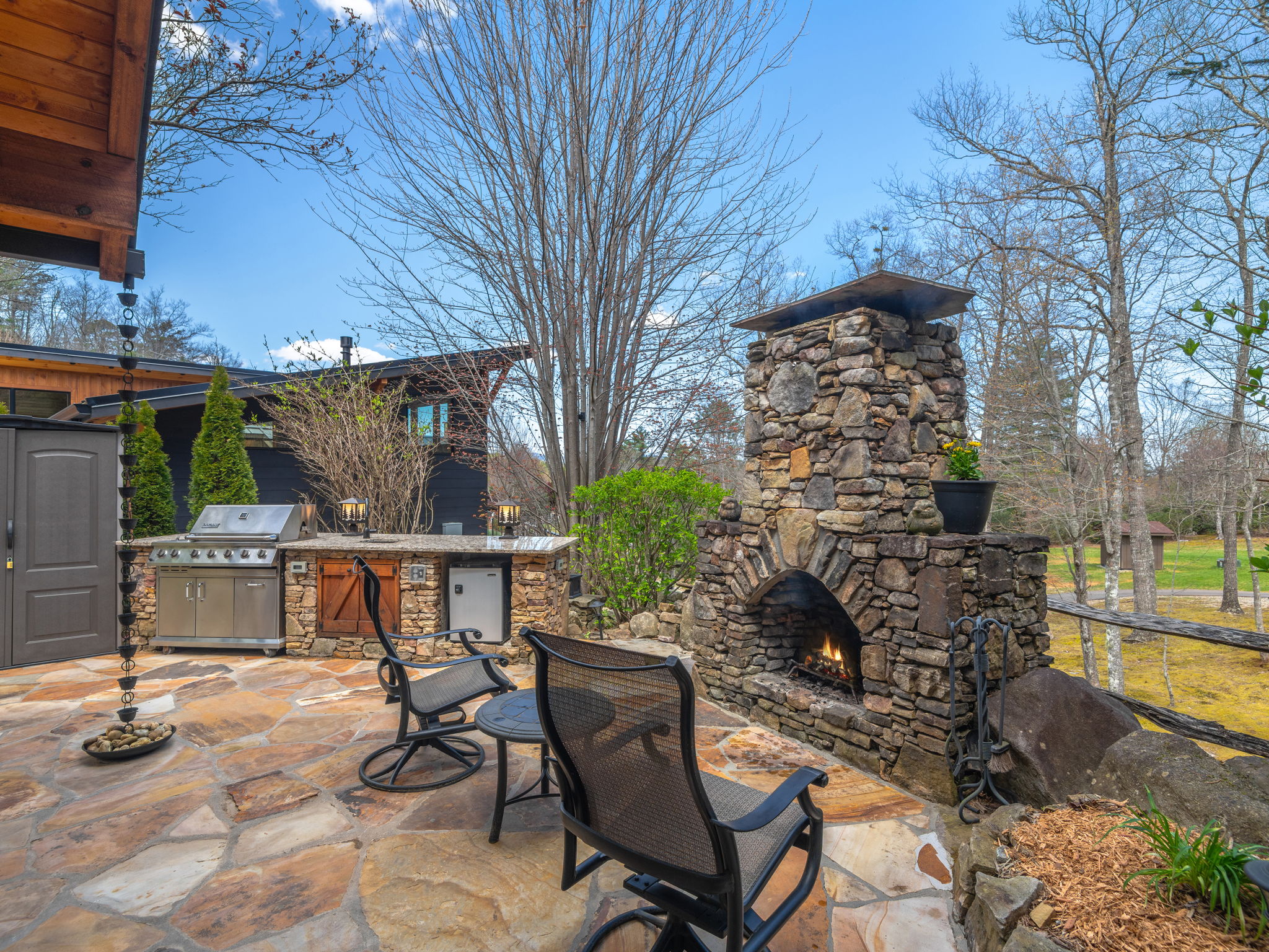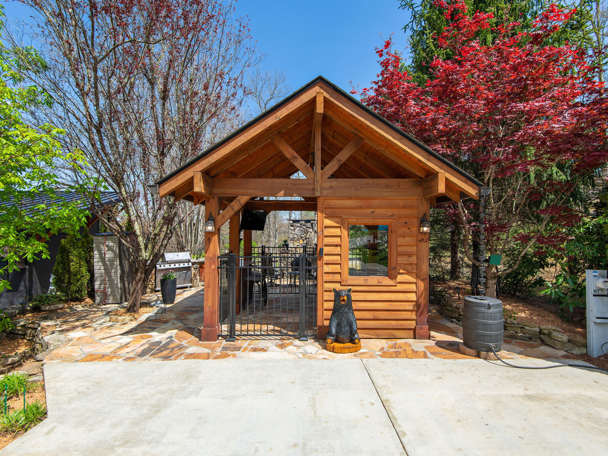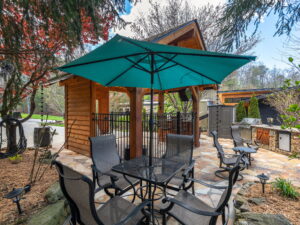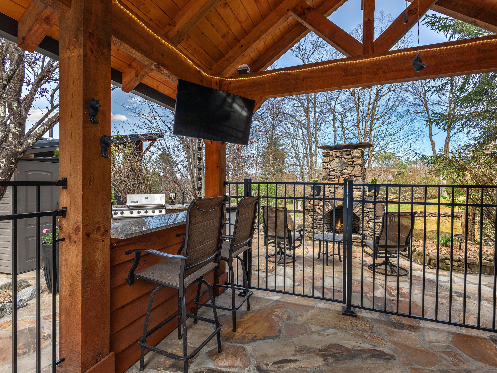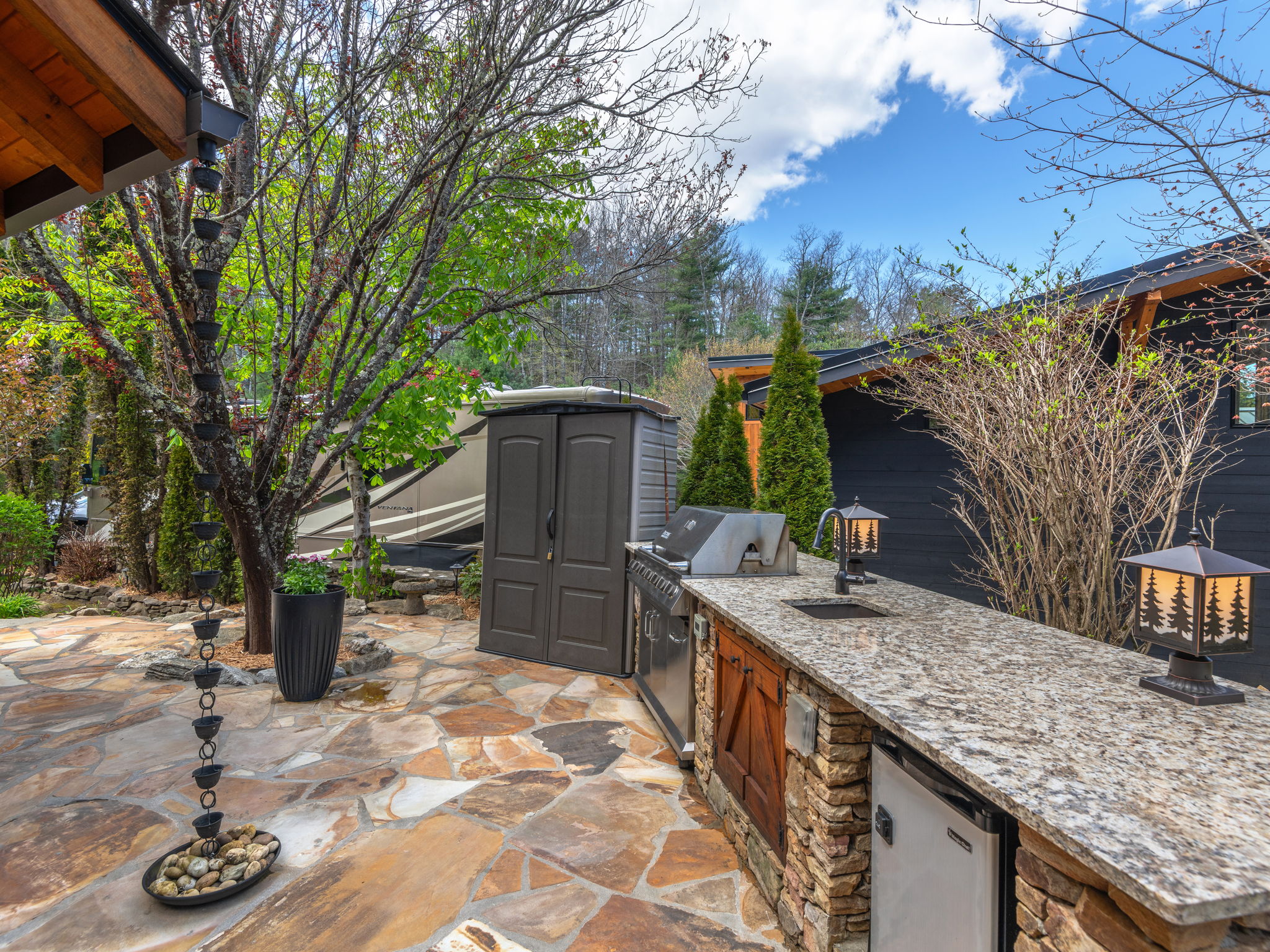 The fully equipped outdoor kitchen features a premium built-in grill, granite counters, sink, refrigerator, and charming rustic cabinetry. Thoughtful details—including rain chains, natural stone accents, and multiple seating areas—create an inviting, resort-quality atmosphere ideal for relaxing or entertaining year-round.