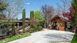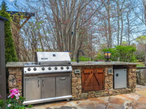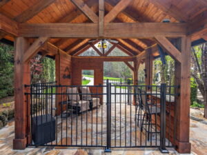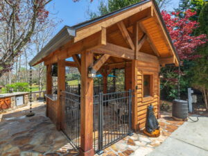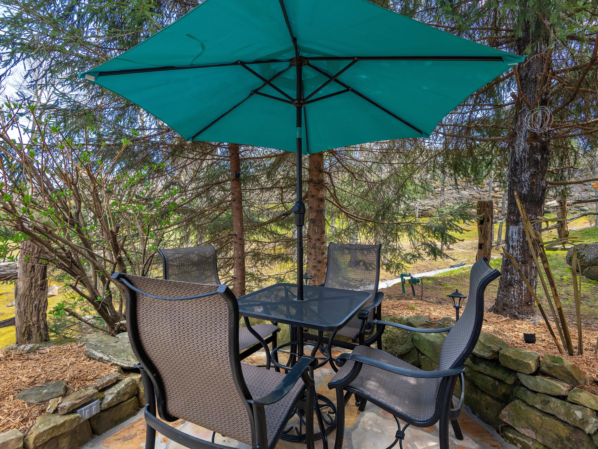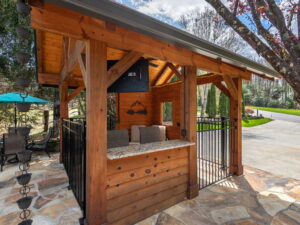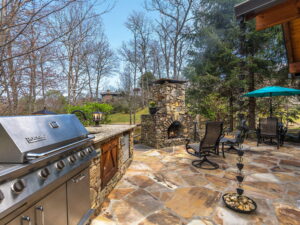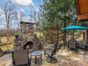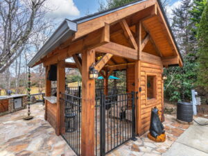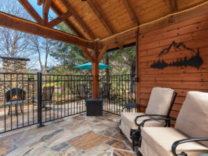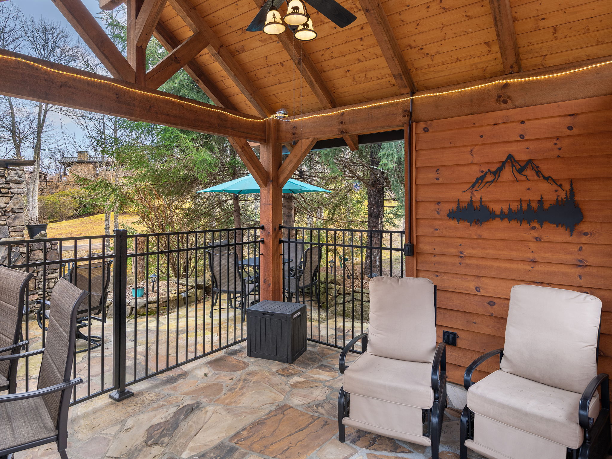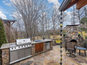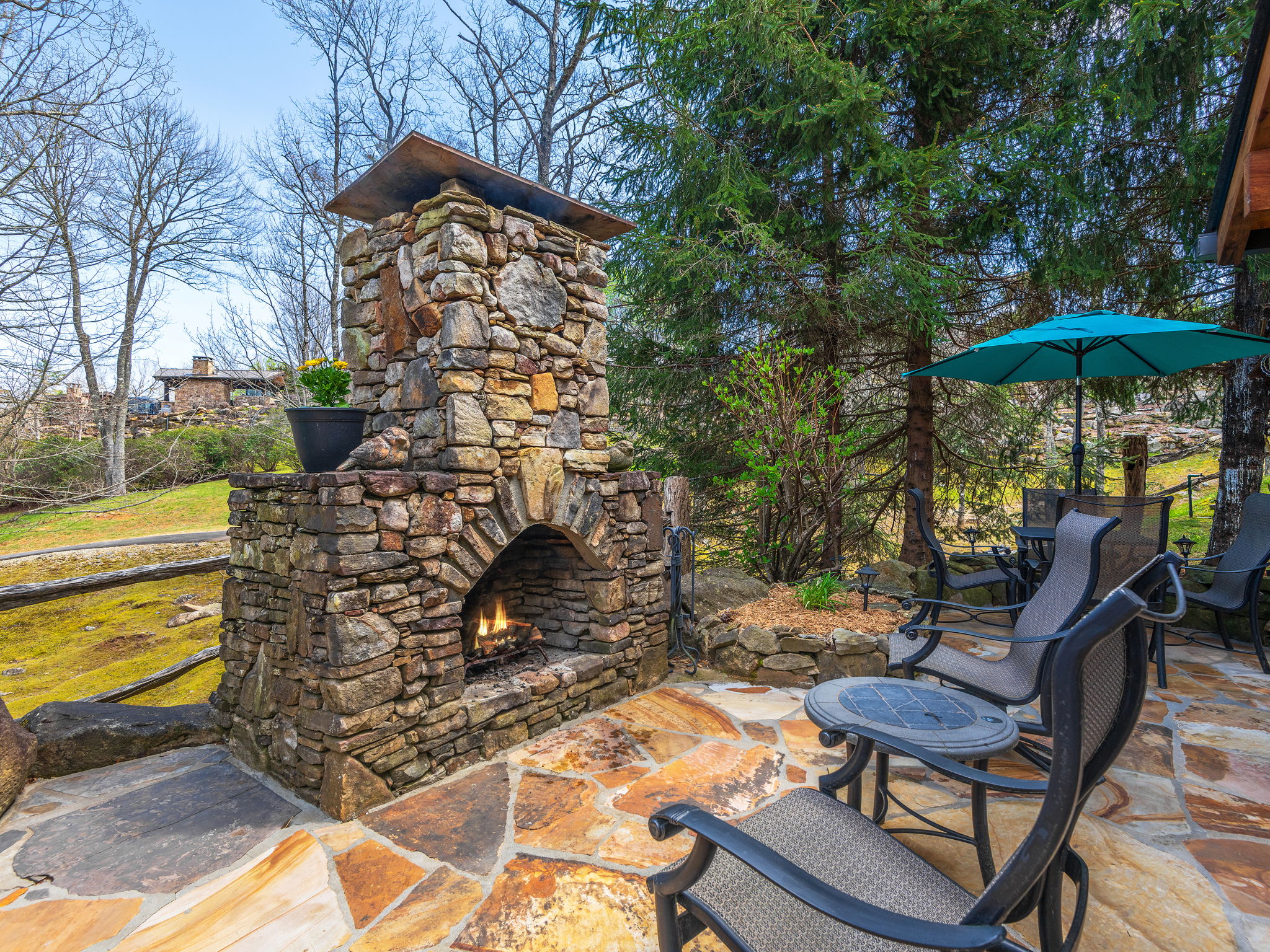 The fully equipped outdoor kitchen features a premium built-in grill, granite counters, sink, refrigerator, and charming rustic cabinetry. Thoughtful details—including rain chains, natural stone accents, and multiple seating areas—create an inviting, resort-quality atmosphere ideal for relaxing or entertaining year-round.
