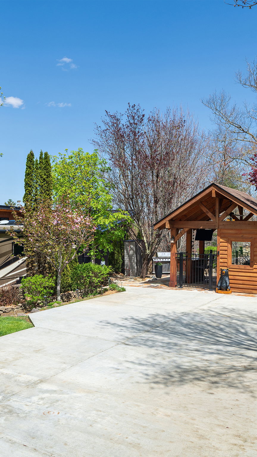 Discover a beautifully crafted outdoor living retreat surrounded by mature trees, lush landscaping, and warm, ambient lighting. A custom pavilion with vaulted timber ceilings, granite serving bar, and mounted TV creates the perfect gathering space, seamlessly flowing onto an expansive flagstone patio anchored by a stunning stone fireplace.