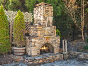 This stunning outdoor space features a custom stone fireplace, a built-in grill with prep area, refrigerator and a long, elegant drive framed by lush landscaping.