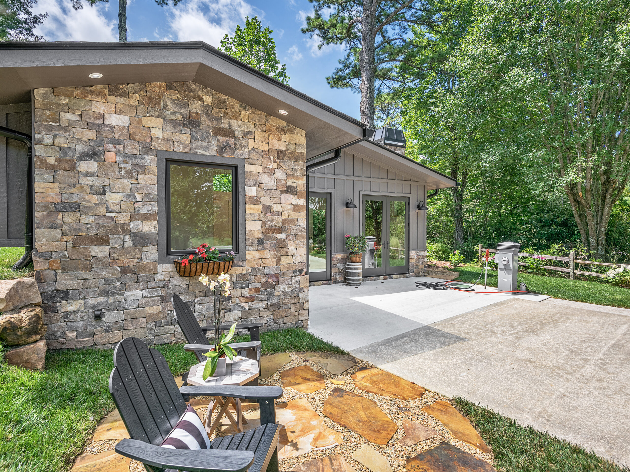 A convenient half bathroom includes a toilet and sink, with plumbing already in place for a future shower, allowing flexibility for personal use or enhanced rental appeal. Just beyond the open living area, a cozy stone patio framed by lush greenery creates a seamless transition between indoor comfort and the peaceful outdoor setting—an ideal feature for short-term stays.
