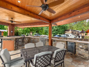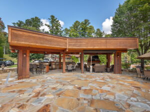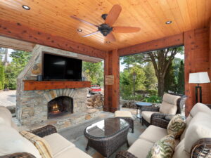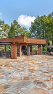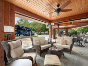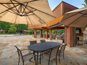This exceptional Valley site offers a spacious, thoughtfully designed outdoor living environment that blends natural beauty with refined craftsmanship and everyday functionality. A large, fully covered pavilion anchors the space, featuring rich wood ceilings, exposed beams, and a cozy stone fireplace that creates a warm, inviting atmosphere.