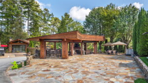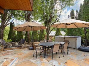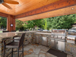Designed for effortless entertaining, the outdoor kitchen showcases stone countertops, a Fire Magic built-in grill with side burner, smoker, refrigerator, hot water heater, and ample storage, complemented by generous bar seating. A beautiful flagstone dining and seating area provides multiple zones for gathering, relaxing, and enjoying meals outdoors.