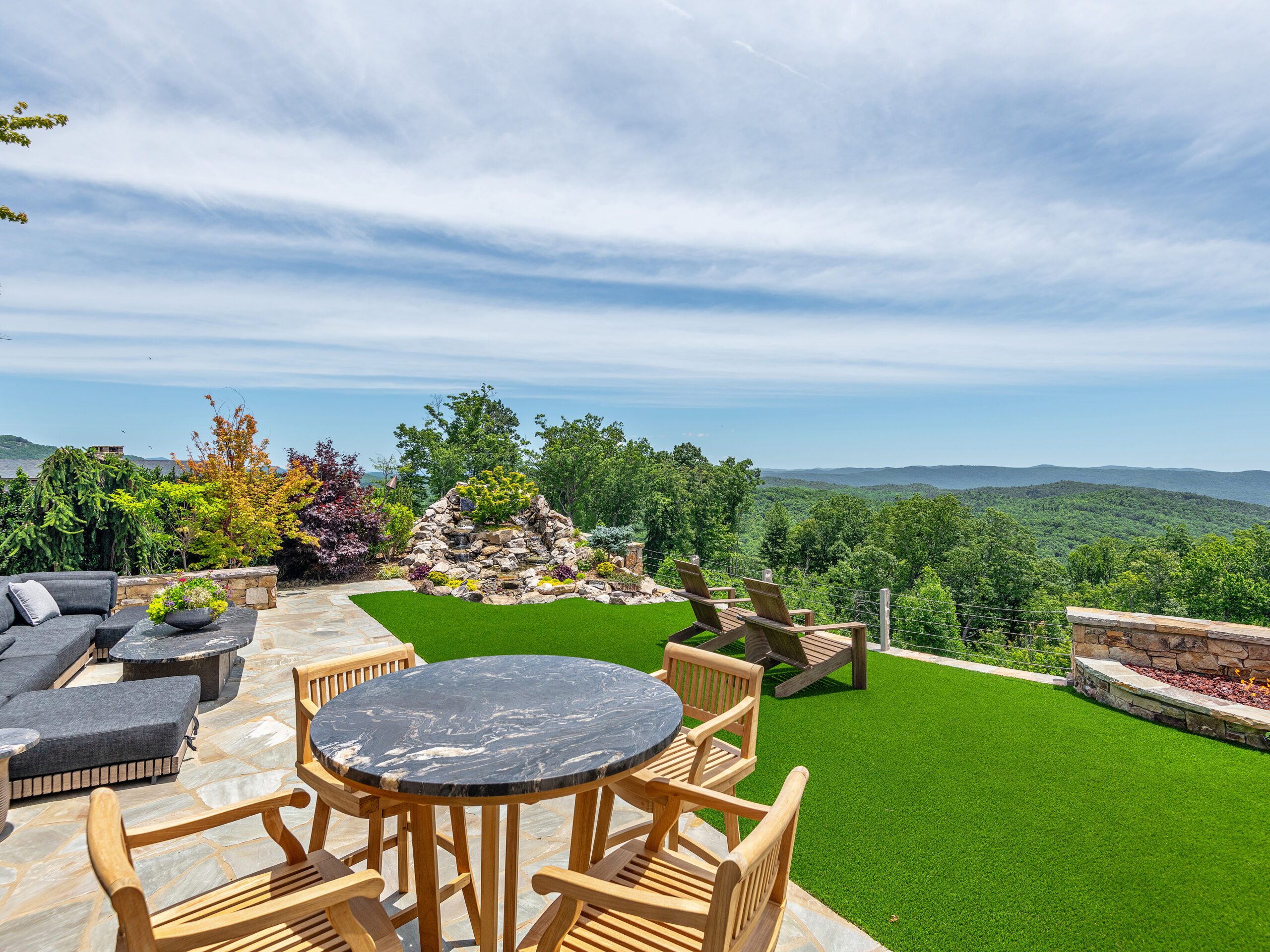 This exceptional Ridge residence blends refined mountain luxury with effortless indoor-outdoor living, showcasing a stunning chef’s kitchen with a waterfall island, custom cabinetry, and warm wood accents that anchor the heart of the home. Thoughtfully designed workspaces and seating nooks are bathed in natural light, while expansive folding glass doors open to an inviting outdoor living area complete with stone fireplace, built-in grill, dining terrace, and lush green lawn—perfect for entertaining or relaxing year-round. High ceilings, curated finishes, and seamless flow throughout create a sophisticated yet comfortable retreat in one of Mountain Falls’ most desirable settings.