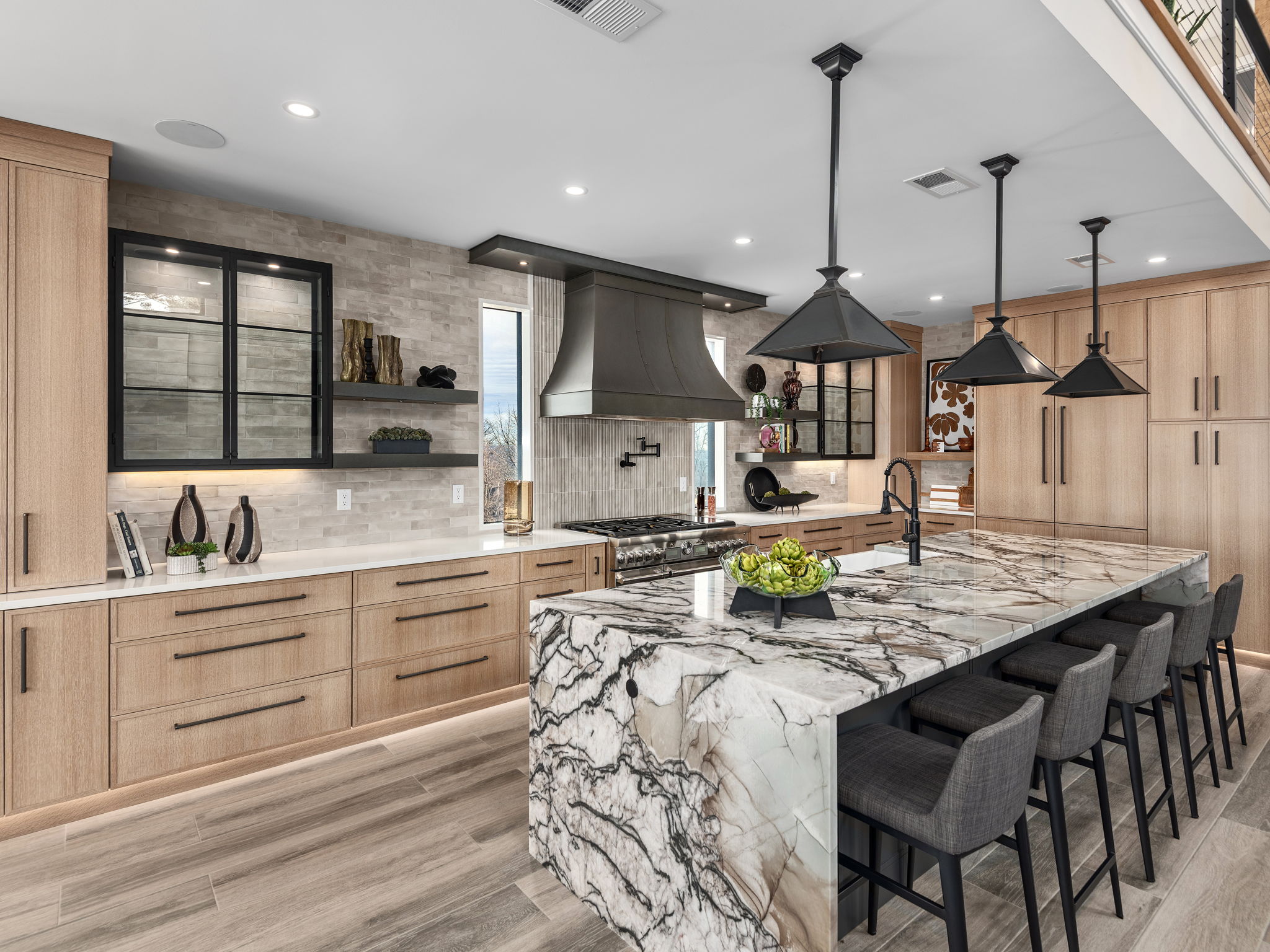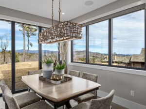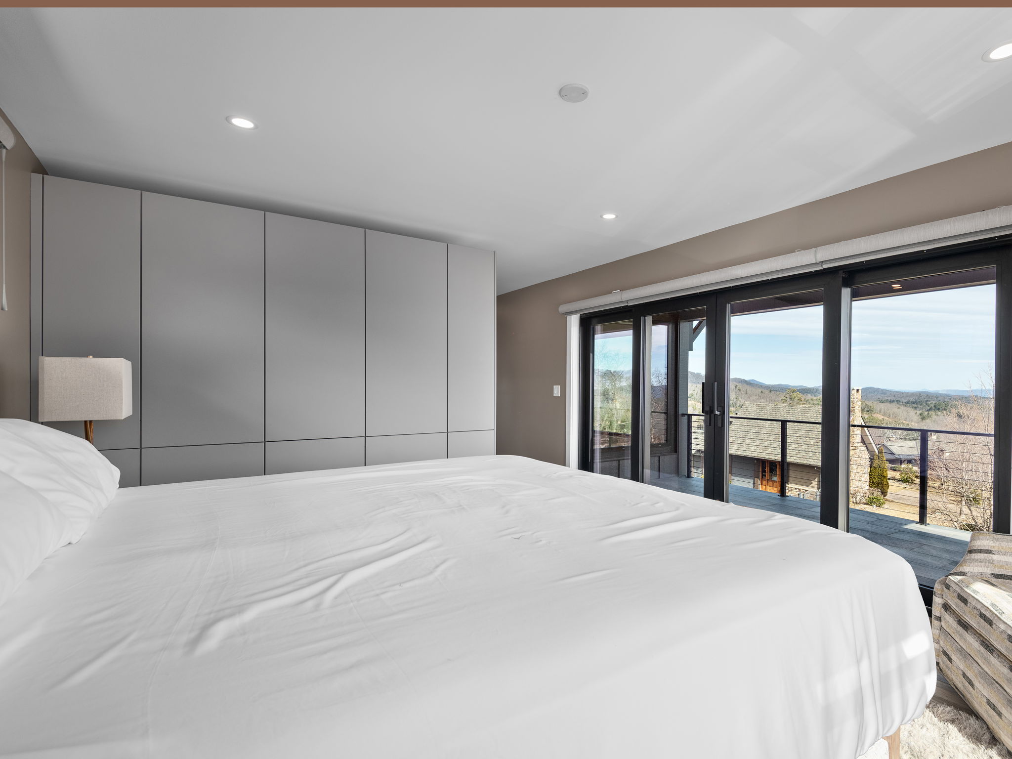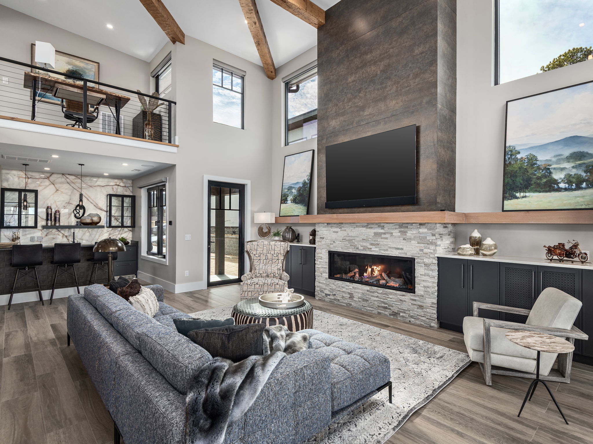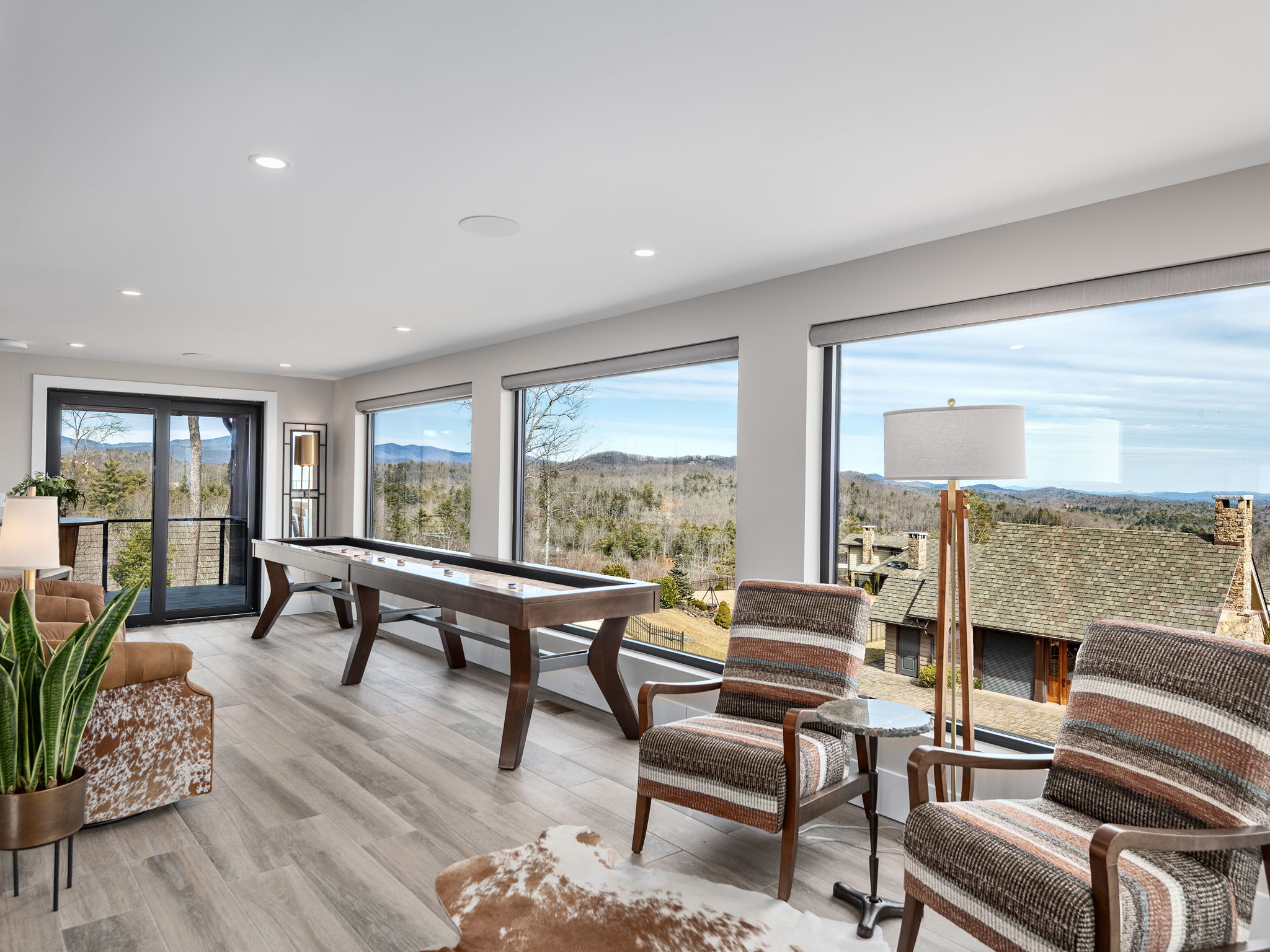 Step inside to soaring ceilings and a dramatic wall of windows that flood the open living space with natural light. The great room features rustic beam details, a sleek linear fireplace, and seamless flow into the chef’s kitchen—complete with a massive waterfall island, professional-grade appliances, and designer lighting. Expansive glass doors lead to an outdoor terrace ideal for entertaining or quiet evenings overlooking the Blue Ridge horizon.