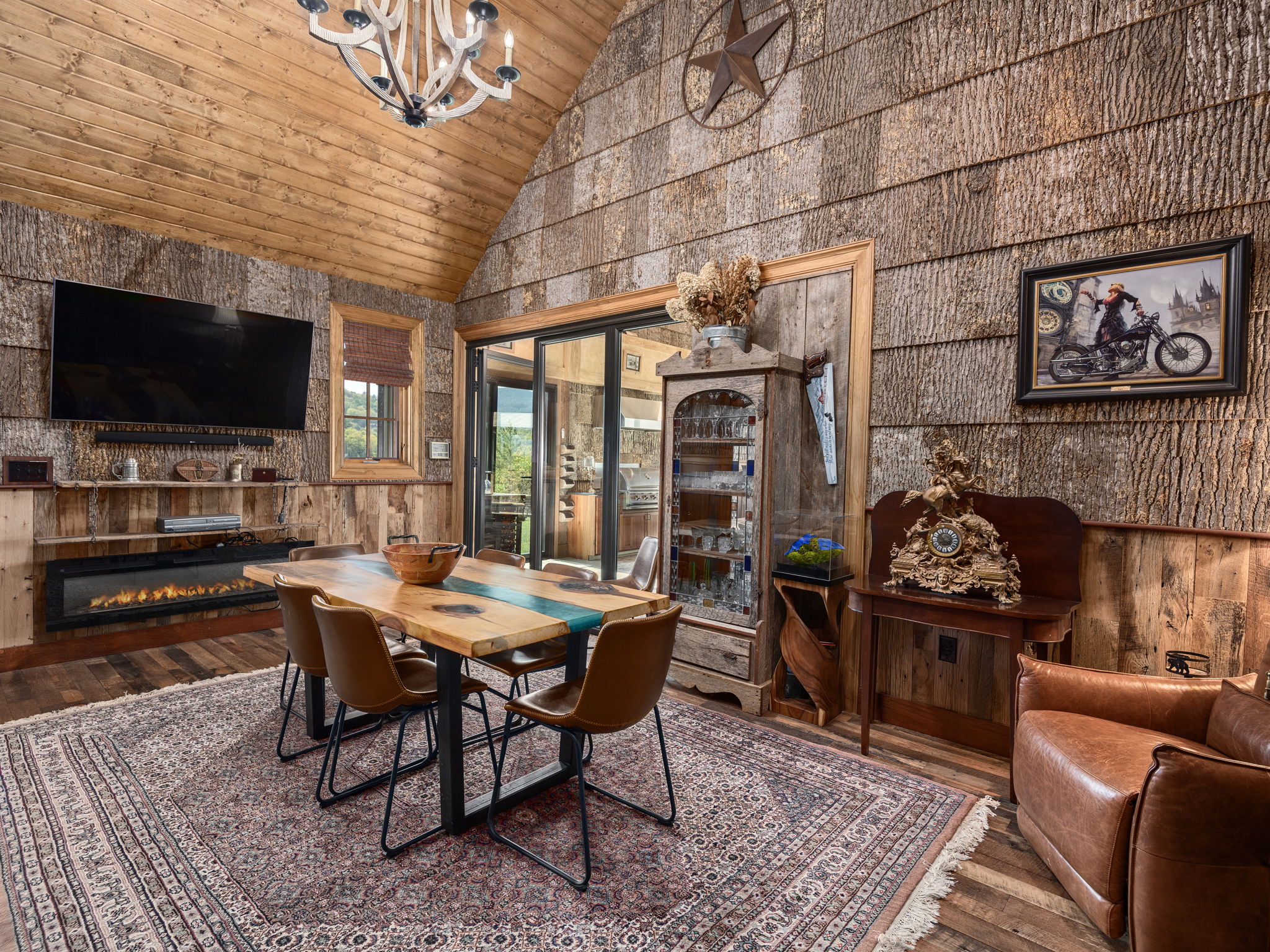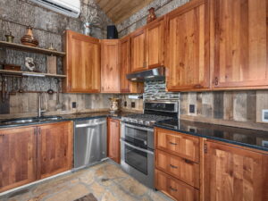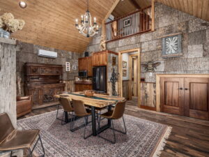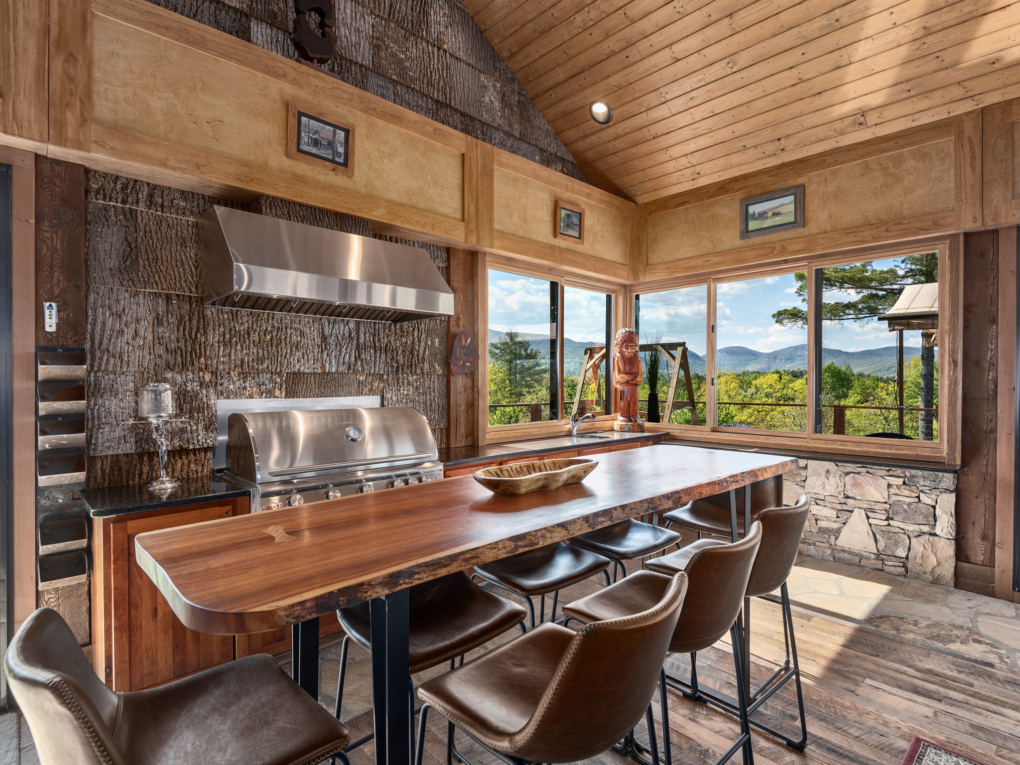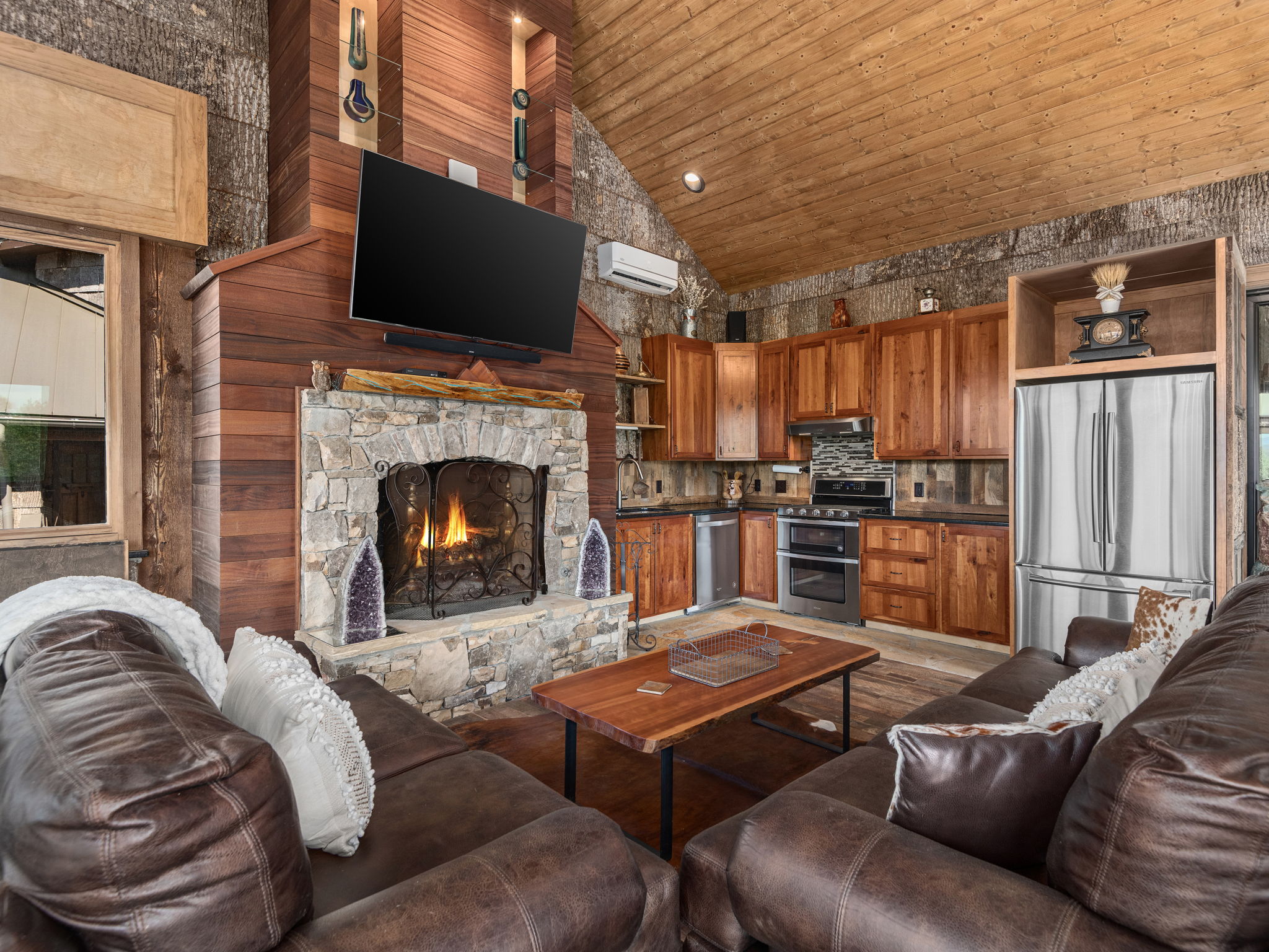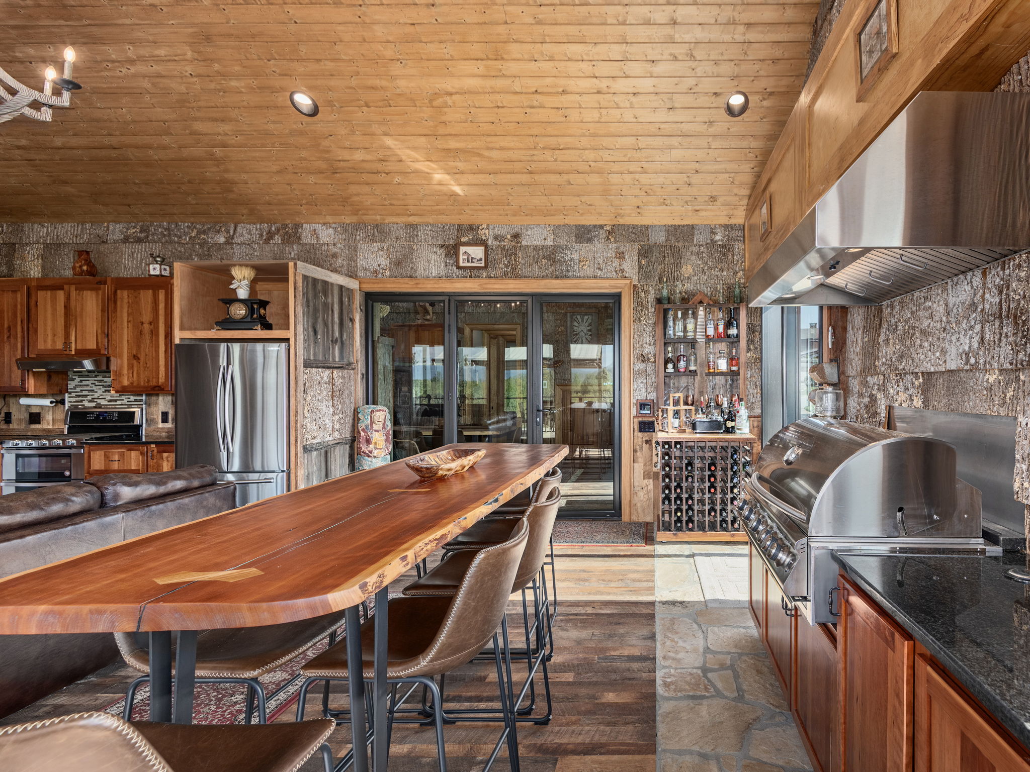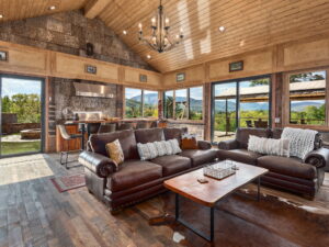 Inside, soaring wood ceilings and rich natural textures fill the space with light and warmth. The open-concept living area flows seamlessly into a well-appointed kitchen and gathering space, ideal for both relaxed everyday enjoyment and hosting.