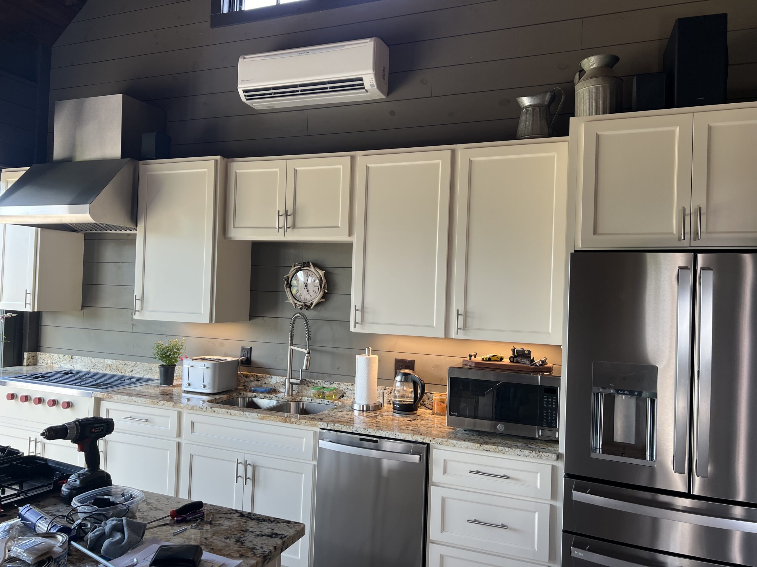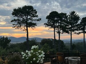 This exceptional Ridge site features a beautifully designed covered outdoor kitchen with sweeping long-range Blue Ridge Mountain views. Recent upgrades elevate the space and include a new Wolf gas grill and additional Wolf grill built into the counter, new microwave, new dishwasher, new washer and dryer, and remote-controlled shades for effortless comfort. Granite countertops, custom cabinetry, stone flooring, and a warm wood ceiling create a refined yet inviting setting ideal for entertaining in every season.