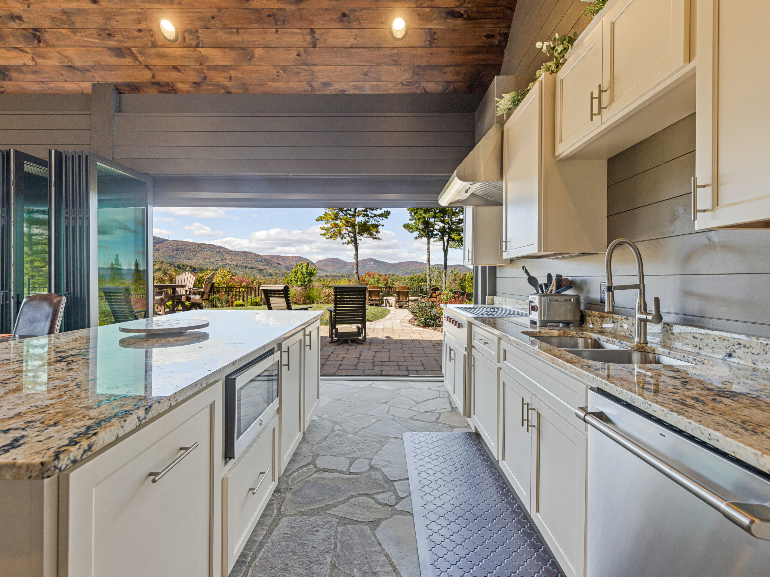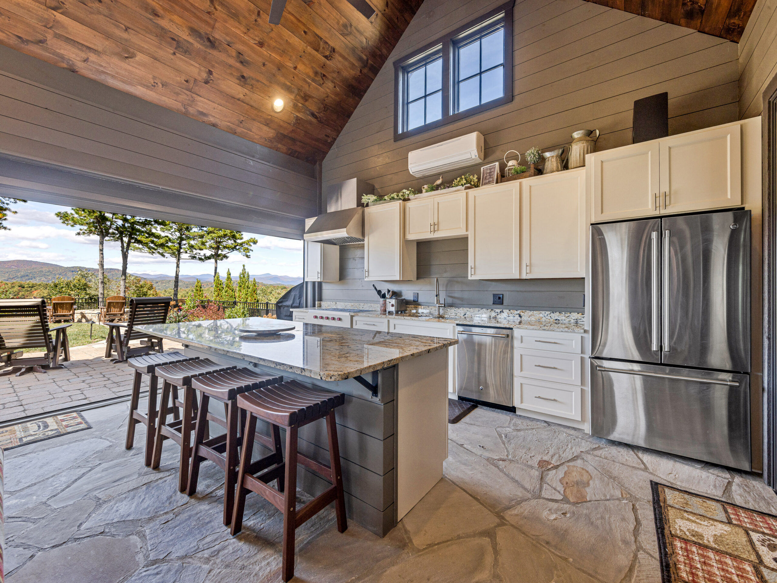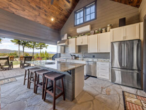 This exceptional Ridge site features a beautifully designed covered outdoor kitchen with sweeping long-range Blue Ridge Mountain views. Recent upgrades elevate the space and include a new Wolf gas grill and additional Wolf grill built into the counter, new microwave, new dishwasher, new washer and dryer, and remote-controlled shades for effortless comfort. Granite countertops, custom cabinetry, stone flooring, and a warm wood ceiling create a refined yet inviting setting ideal for entertaining in every season.